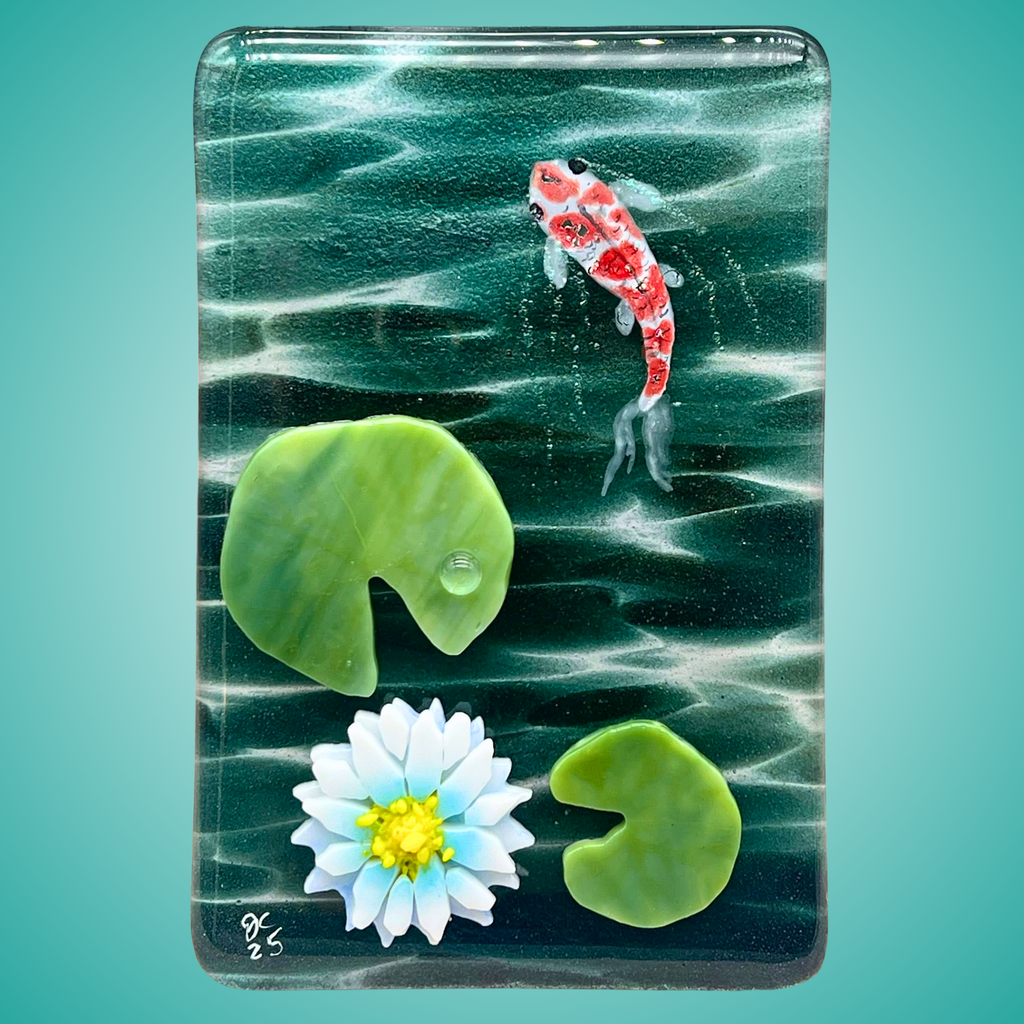 Handcrafted fused glass Koi Pond artwork by Jennifer Campagna. A serene, vibrant piece featuring flowing colors and koi fish details — perfect for décor or gifting.