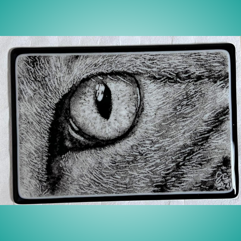 This striking fused-glass artwork captures the intense, soulful gaze of a cat in extraordinary detail. Created using finely sifted glass powders, every hair and shadow is hand-drawn and kiln-fused to achieve a realistic, textured finish. Bold, monochromatic contrast pulls you into the depth of the eye, making this piece a powerful focal point for any modern or nature-inspired space.