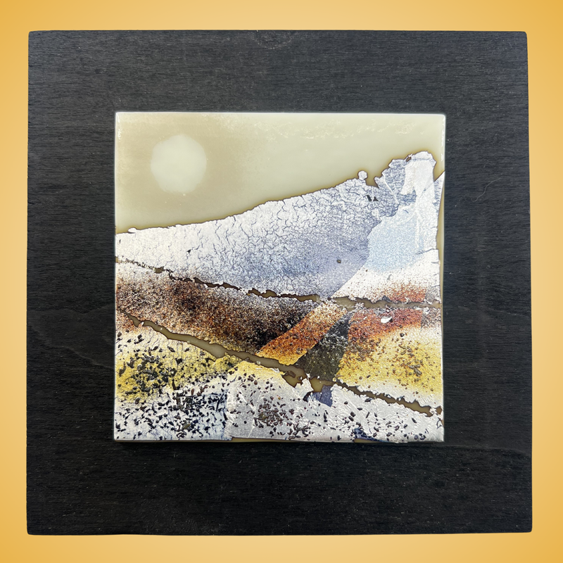 Soft earth tones and cracked metallic textures form a serene abstract landscape, illuminated by the gentle glow of a pale sun. Created with layered glass and reactive powders, this piece blends organic movement with modern minimalism. A calming, atmospheric artwork that brings quiet depth and warmth to any space.