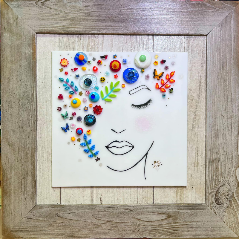 Soft lines and delicate glass accents create a serene portrait of a woman adorned with vibrant flowers, shapes, and nature-inspired motifs. Each detail is hand-placed, forming a colorful halo of summer energy around her peaceful expression. A modern, uplifting glass artwork celebrating beauty, creativity, and the quiet magic of the season.