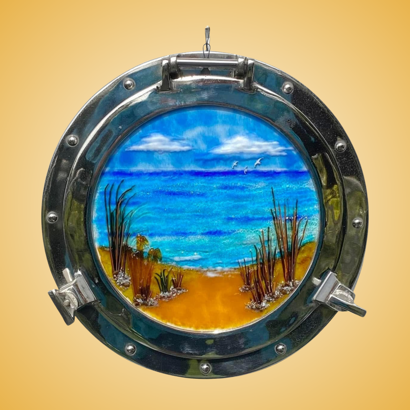 This vibrant fused-glass seascape transforms an authentic reclaimed porthole into a window to the coast. Brilliant blues, warm sandy tones, and hand-shaped reeds create a peaceful shoreline scene filled with depth and movement. A striking nautical art piece that blends ocean serenity with maritime history—perfect for beach houses, coastal décor, or anyone dreaming of the sea.