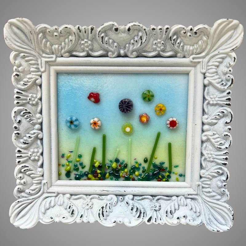 Sweet and cheerful, this mini fused-glass garden blooms with colorful handcrafted flowers set against a soft, pastel sky. Each tiny element adds playful texture and shine. Framed in a beautifully ornate white frame, this charming artwork brings a touch of whimsy and joy to any shelf, wall, or small space.